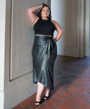 A Faux Leather Maxi Wrap Skirt which consists of the materials Polyester and Spandex.